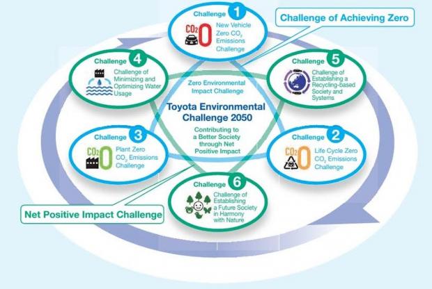 Toyota cũng đang nỗ lực trong việc bảo vệ môi trường thông qua Thách thức và Mục tiêu hành động bảo vệ môi trường đến năm 2050. Được công bố vào năm 2015, Toyota đã đề ra sáu thách thức môi trường cần đạt được vào năm 2050 nhằm mục tiêu giảm hoàn toàn tác động tiêu cực cũng như tăng cường các tác động tích cực tới môi trường.