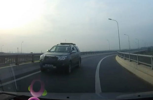 Một chiếc Toyota Fortuner cố tình đi ngược chiều trên đường dẫn từ Quốc lộ 5 lên cầu Thanh Trì suýt gây tai nạn với chiếc xe đang đi đúng làn.