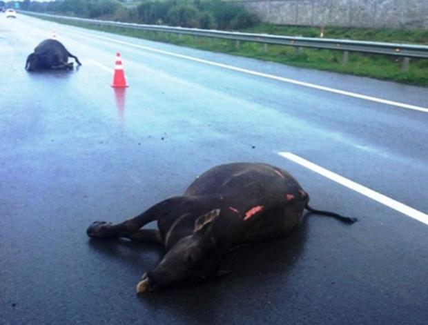 Hiện trường 2 con trâu nằm trên đường cao tốc