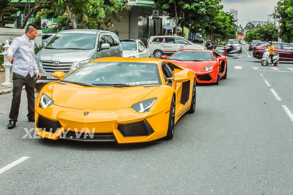 Kế đến là cặp đôi Aventador màu vàng và cam rực rỡ, nổi bật không kém.