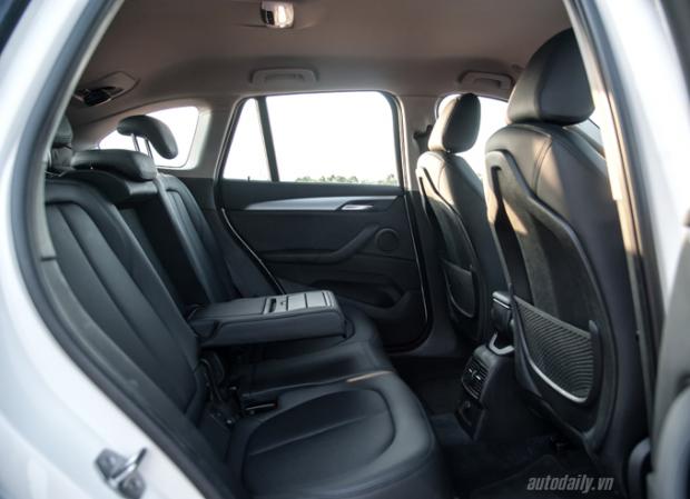 Tiến ra khoang sau, BMW X1 2016 sở hữu khoang sau khá là rộng rãi. Trên quãng đường di chuyển đến địa điểm chụp hình, chúng tôi có thử cho 3 người lớn cùng ngồi tại khoang này, điều khá ngạc nhiên cả 3 đều cảm thấy hài lòng mặc dù đây chỉ là một chiếc SAV cỡ nhỏ. Khoảng để chân cũng như khoảng cách đầu đến trần đều rất thoải mái kể cả người ngồi giữa. Tại đây, BMW X1 sở hữu cửa gió điều hoàn đặt giữa, một số ngăn chứa đồ nhỏ xuất hiện trên kệ tỳ tay đủ để bạn cất điện thoại, cốc hay chai nước khi di chuyển.