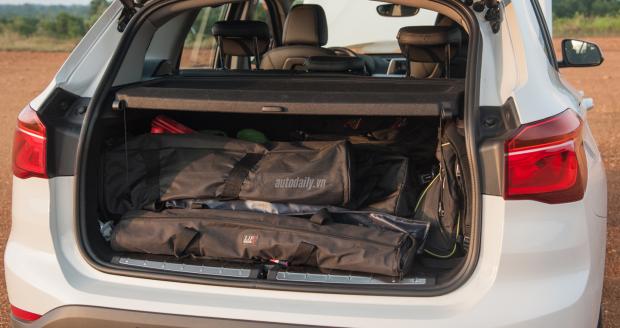 Bỏ qua phần thiết kế có phần khó hiểu này trên BMW X1, tôi sẽ khám phá kĩ hơn không gian chứa đồ cũng như những trang bị tại khoang sau của xe. Theo công bố của nhà sản xuất, BMW X1 thế hệ thứ 2 sở hữu khoang chứa đồ có dung tích 505L, tuy nhiên nếu cần tăng dung tích này lên bạn sẽ chỉ cần thao tác bấm những nút bấm 2 bên thành để hàng ghế thứ 2 tự động gập phẳng xuống. Khi này dung tích đã lên đến 1.550L, khá là rộng. Ngoài ra, do BMW X1 thế hệ thứ 2 không có lốp dự phòng nên phía dưới mặt sàn khoang sau cùng sẽ còn có thêm một không gian chứa đồ nhỏ nữa khá tiện dụng.