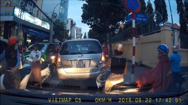 Sự việc xảy ra vào lúc 5h43 phút chiều ngày 22/9/2016 tại ngã tư Ngô Thời Nhiệm - Trương Định, TP.HCM, và được xe đi sau quay lại.
