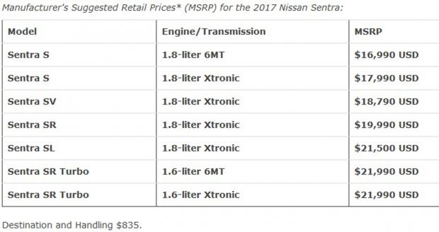 Có mặt trên thị trường Mỹ, Nissan Sentra sẽ có tổng cộng 7 biến thể đi kèm giá bán lần lượt như sau: Sentra S số sàn (16.990 USD), Sentra S hộp số Xtronic (17.990 USD), Sentra SV Xtronic (18.790 USD), Sentra SR Xtronic (19.990 USD), Sentra SL Xtronic (21.500 USD), Sentra SR Turbo số sàn (21.990 USD), Sentra SR Turbo Xtronic (21.990 USD).