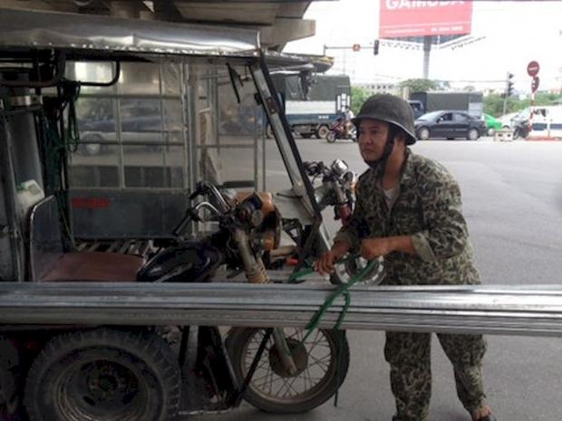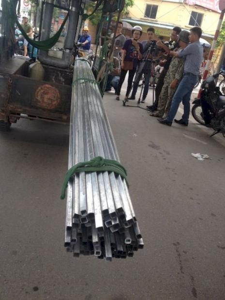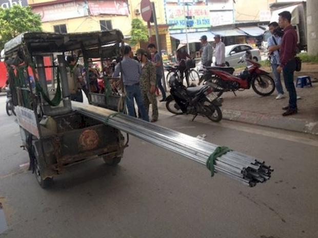 Chiếc xe ba bánh chở những đoạn thép dài không hề được che chắn, tựa như những khẩu pháo, ngọn lao nhọn hoắt hiên ngang đi trên phố. Chỉ cần một chút sơ sểnh là nguy cơ xảy ra tai nạn chết người