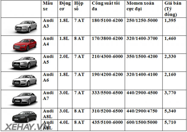 Audi A8L 4.0L là mẫu xe đứng đầu bảng với giá 5 tỷ 710 triệu đồng, trong khi đó với mức giá 1 tỷ 395 triệu đồng của Audi A3 là một lựa chọn không tồi cho những ai muốn sở hữu một chiếc xe đẳng cấp đến từ Đức với mức giá phải chăng.