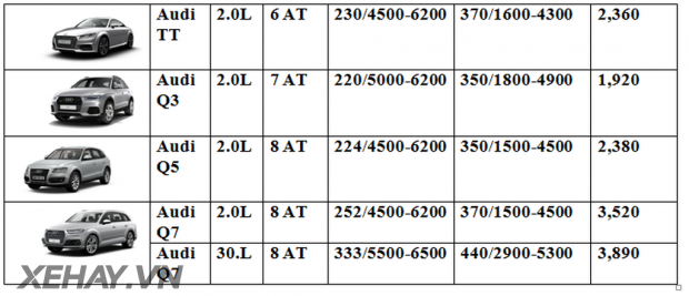 Dưới đây là bảng giá cập nhật vào tháng 9/2016 các mẫu xe của Audi tại Việt Nam (đã bao gồm thuế nhập khẩu, thuế TTĐB, thuế GTGT), chưa bao gồm các phụ kiện kèm theo.