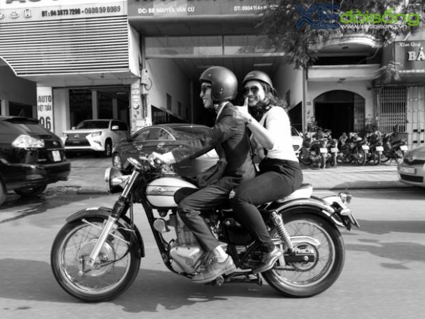 Một chiếc Kawasaki Estrella với cặp đôi vui vẻ dạo phố
