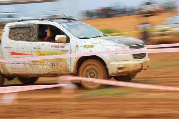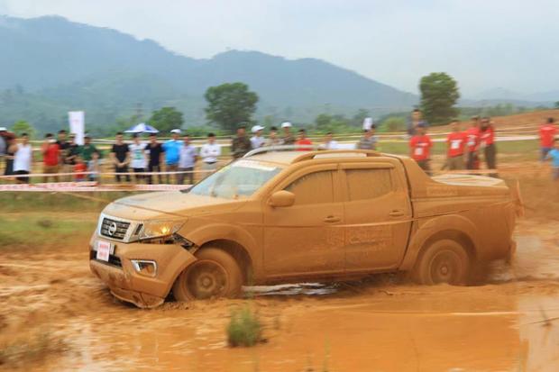Một mẫu bán tải đã nhuộm bùn từ nóc đến lốp, cản trước bung, nhưng vẫn băng băng tiến.