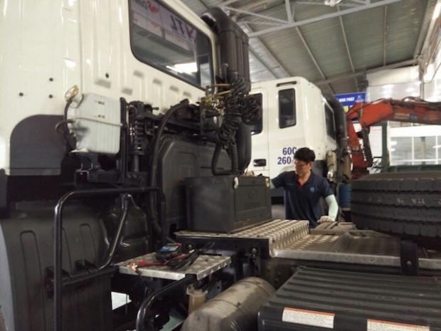 Chuyên gia Hàn Quốc đang kiểm tra thực tế xe tải của khách hàng tại đại lý của Namviet Motor