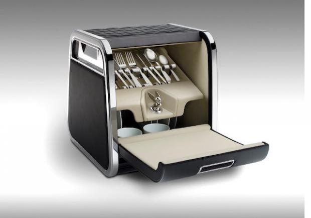 2. Hộp picnic: Đây là hộp chuyên dụng để chứa các vật dụng dành cho chuyến picnic như dao, dĩa, thìa và các chén đĩa sành sứ sang trọng. Khách hàng có thể nhận ra những đồ vật được đựng trong hộp picnic đều được lấy từ bộ sưu tập nổi tiếng về đồ sành sứ, Sublime Collection, thuộc nhà sản xuất sứ nổi tiếng của Pháp. Ngoài ra, bên trong hộp picnic của Mulliner còn có chứa bộ dao, dĩa, thìa, tách uống trà nổi tiếng đã đạt giải thưởng quốc tế, Alta Robbe và Berking.