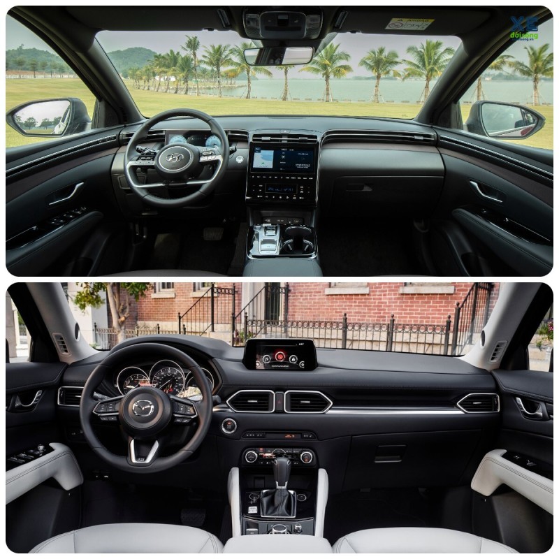 Mặc dù thiên về sự đơn giản với triết lý thiết kế “Less Is More” nhưng khoang cabin của CX-5 vẫn tỏ ra ấn tượng và có điểm nhấn với các chi tiết mạ chrome ở viền cửa gió điều hoà và phần viền khu vực điều khiển trung tâm. Điểm trừ của CX-5 khi chỉ trang bị màn hình giải trí kích thước 7 inch so với 10,25 inch trên Tucson. Hơn nữa, bảng đồng hồ của CX-5 cũng có phần lỗi thời hơn so với bảng đồng hồ điện tử của Tucson 1.6 Turbo với khả năng hiển thị hình ảnh phía sau khi bật đèn xi-nhan thông qua hệ thống gương nằm trên kính chiếu hậu.
