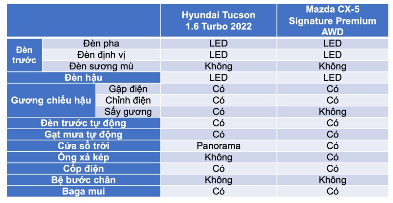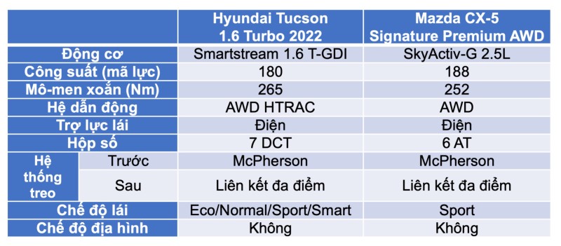 Có thể thấy, với mức giá chênh lệch lênh tới gần 40 triệu đồng, nhưng Mazda CX-5 2.5L AWD lại “nghèo” trang bị, tiện nghi hơn rõ rệt so với Hyundai Tucson 1.6T 2022. Không những thế, khả năng vận hành của CX-5 2.5L AWD cũng không có gì vượt trội hơn so với “tân binh” đến từ Hàn Quốc.