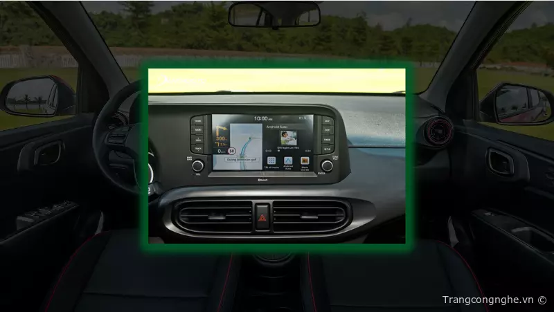 Hyundai Grand i10 2023 được trang bị hệ thống giải trí và tiện nghi đầy đủ để mang lại trải nghiệm tuyệt vời cho người dùng. Màn hình giải trí trung tâm được thiết kế với kích thước lớn lên đến 8 inch và tích hợp định vị dẫn đường. Xe cũng được trang bị cụm điều khiển media kết hợp với tính năng nhận diện giọng nói, hỗ trợ đầy đủ các chức năng kết nối Apple CarPlay/Android Auto, Bluetooth, Radio, MP4 với âm thanh được trang bị 4 loa.