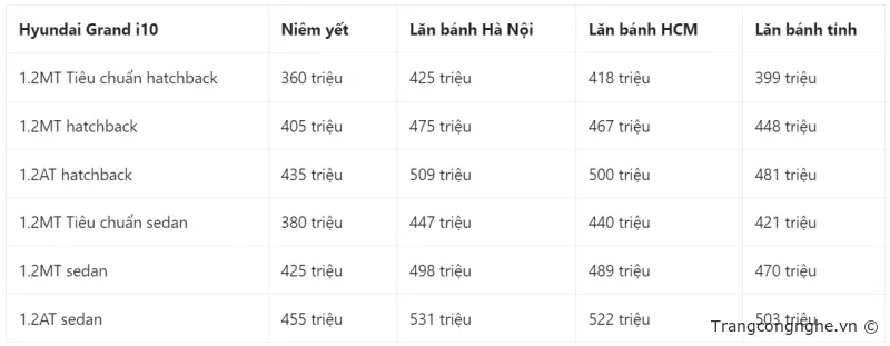 Bảng giá xe Hyundai i10 2023 tại Việt Nam (giá tham khảo, chưa bao gồm thuế và phí):