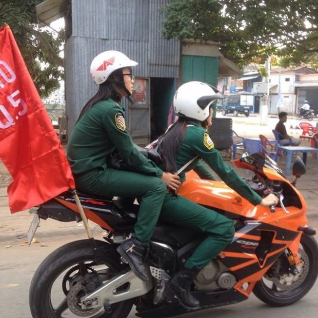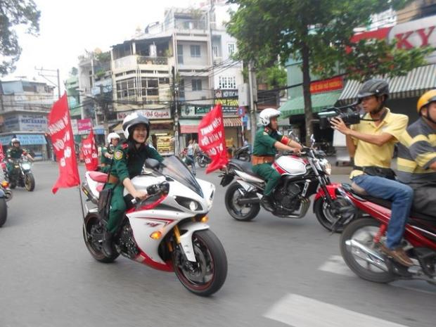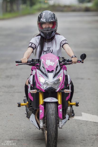 Và chững chạc trong bộ đồ khi tham gia công tác dẫn đoàn mô tô trên chiếc Kawasaki Z800 Hello Kitty.