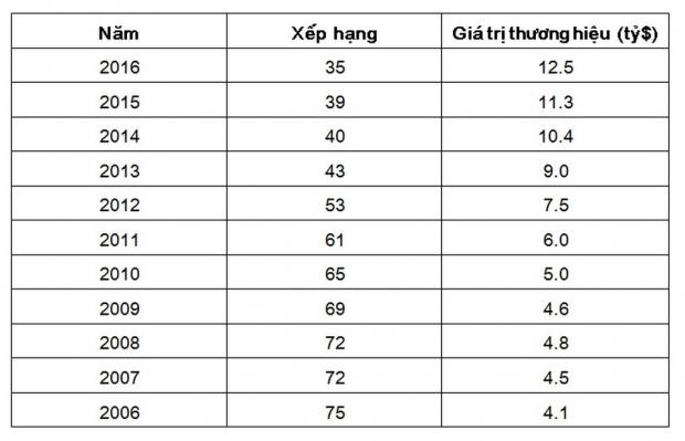 Bảng xếp hạng của Hyundai trong 1 thập kỷ qua (Interbrand)