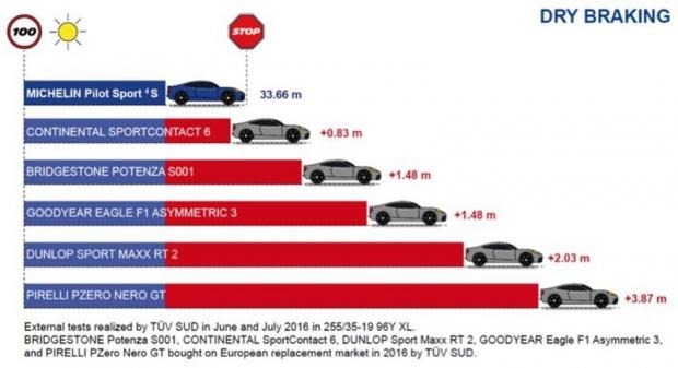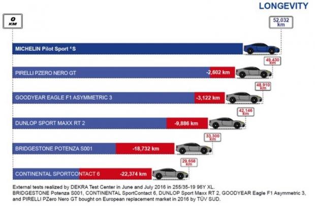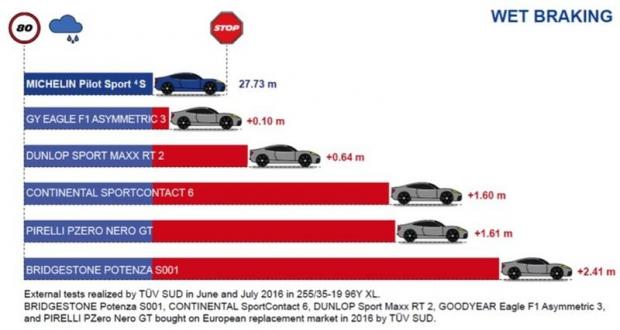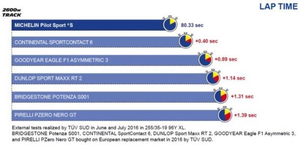 Trong loạt ảnh dưới đây, có bốn bảng xếp hạng với kết quả các PS4S với bốn kịch bản: phanh khô, phanh ướt, thời gian hoàn thành đường đua, và tuổi thọ lốp. Đúng như dự kiến, Michelin Pilot Sport 4 S kích thước 255/35-19 96Y XL đã vượt trội hơn các đối thủ trực tiếp trong mọi bài thử nghiệm. Cùng tham gia thử thách lần này có Continental Sport Contact 6, Goodyear Eagle F1 Asymmetric 3, Bridgestone Potenza S001, Dunlop Sport Maxx RT 2, và Pirelli P Zero Nero GT.