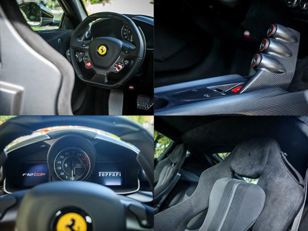 Trái ngược với bộ áo vàng rực, bên trong khoang lái của chiếc Ferrari F12tdf này sử dụng gam màu đen của chất liệu da Alcantara cao cấp. Điểm nhấn vẫn là vô số các chi tiết được phủ carbon cao cấp. F12tdf còn được xem như phiên bản mạnh mẽ hơn của siêu xe Ferrari F12 Berlinetta.