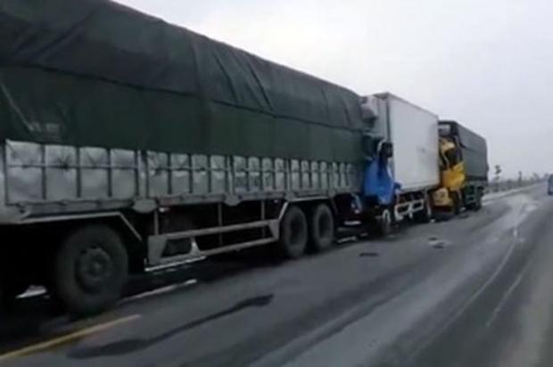 Tại hiện trường, 3 chiếc xe tải găm chặt vào nhau, hư hỏng nặng. May mắn tất cả các tài xế đều chỉ bị xây xước nhẹ.