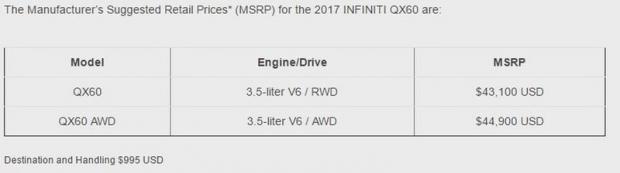 Xe có giá từ 44.095 $ (989 triệu VNĐ, đã bao gồm phí vận chuyển và lệ phí xử lý) với phiên bản Infiniti QX60 dẫn động cầu sau và phiên bản dẫn động tất cả các bánh sẽ có giá 45.895 $ (1 tỷ 30 triệu VNĐ).