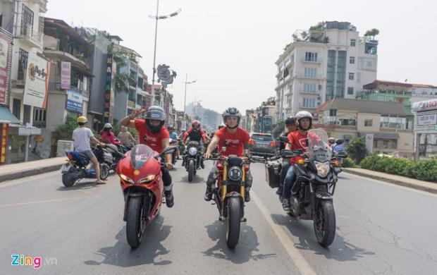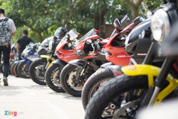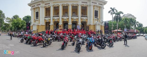 Dàn Ducati gồm nhiều chủng loại như Scrambler, 1199 Panigale, Monster, 899 Panigale, Diavel... xếp hàng ngay ngắn tại địa điểm tập kết ở Đông Anh, Hà Nội.