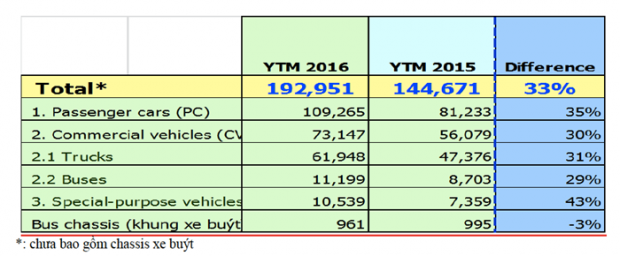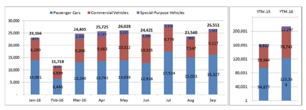 Tổng lượng bán hàng của toàn thị trường tính đến hết tháng 9/2016 là 214.398 xe, tăng 31% so với cùng kì năm ngoái. Xe ô tô du lịch tăng 30%; xe thương mại tăng 31% và xe chuyên dụng tăng 43% so với cùng kì năm ngoái.