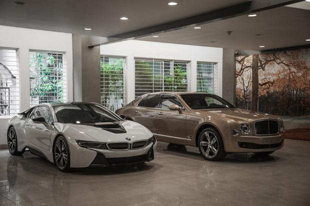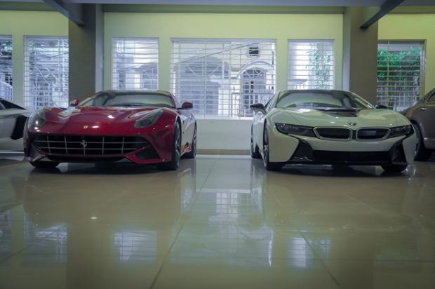 Xe thể thao BMW i8 bên cạnh chiếc Ferrari F12 Berlinetta. BMW i8 từng tạo nên cơn sốt trong giới chơi xe tại Việt Nam, với số lượng nhập về khá nhiều dù không được phân phối chính hãng.