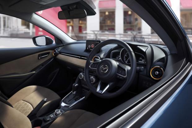 Mazda 2 được bổ sung đèn sương mù dạng LED đi kèm viền kim loại mạ cờ-rôm phía trên, kiểu nan đơn trên lưới tản nhiệt có màu trùng màu ngoại thất trước đó được thay thế bằng màu kim loại. Gương chiếu hậu tích hợp đèn báo rẽ là một tùy chọn.