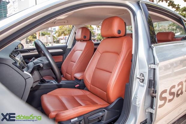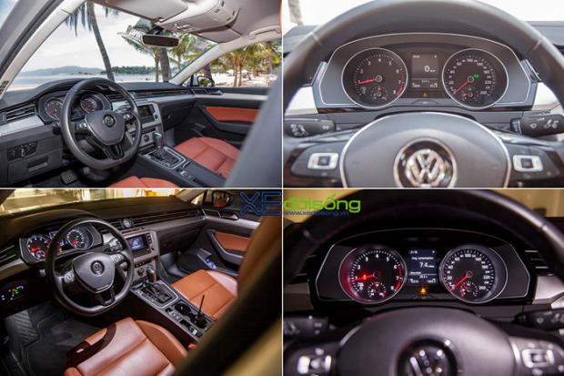 VW Passat 2016 có trục cơ sở 2.791mm, kích thước tổng thể (Dài x Rộng x Cao) tương ứng (4.767 x 1.832 x 1.456)mm. Các chỉ số tương ứng trên Toyota Camry là 2.775mm và (4.850 x 1.825 x 1.470)mm. Chất lượng vận hành của Passat vượt trội hơn hẳn so với các sedan hạng D thương hiệu từ Nhật Bản hay Hàn QuốcBước vào khoang cabin, ấn tượng đầu tiên với Passat là không gian bên trong vô cùng rộng rãi, hàng ghế sau thoải mái ở cả khoảng để chân và không gian trên đầu. Cũng một đặc trưng ở các dòng xe Volkswagen là các cửa xe có độ dày nhỏ, góp phần tạo cảm giác cho không gian trong xe rộng rãi hơn. Tiếp đến, các ghế ngồi được bọc da thật cao cấp, rất êm ái không thua kém gì như trên các xe sang trọng. Sử dụng tông màu nâu vàng đem lại cảm giác sang và ấm cúng. Khu vực bảng tap-lô, nổi bật là chi tiết ốp trang trí nhôm màu bạc sáng chạy theo chiều ngang, cùng với ốp bề mặt bảng điều khiển trung tâm, trong khi vô-lăng bọc da. Tuy nhiên chúng tôi cho rằng kiểu ốp bề mặt bảng trung tâm tối màu đem lại hiệu quả thị giác và thẩm mỹ tốt hơn so với ốp sáng màu như này.