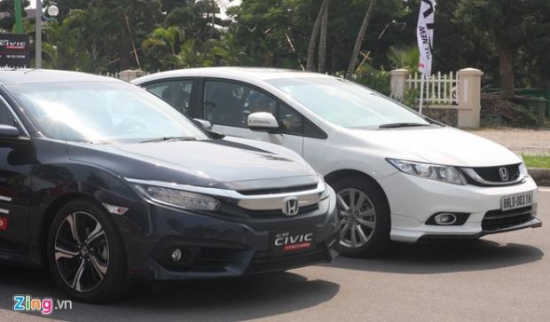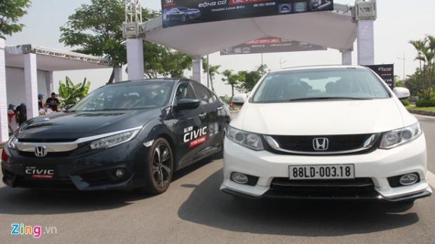 Honda Civic 2017 (trái) chính thức được giới thiệu tại thị trường Việt Nam hôm 5/10 tại triển lãm Vietnam Motor Show 2016. Mẫu Civic mới thuộc thế hệ thứ 10 còn bản cũ (bên phải) là thế hệ thứ 9.