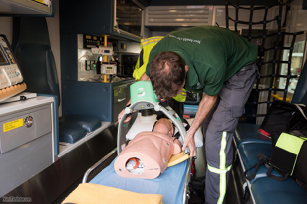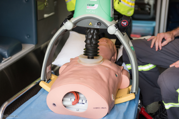 Máy CPR tự động Lucas 2 đang được triển khai trên mô hình.