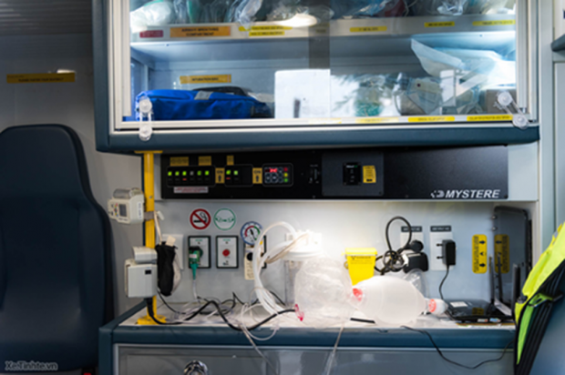 Trong xe cấp cứu còn có bơm tiêm điện, máy hút đàm, các đệm hơi để cố định nạn nhân, cùng rất nhiều các thiết bị y tế khác phục vụ cho việc cấp cứu. Bên dưới đây là liệt kê những thứ quan trọng trên xe cấp cứu của *9999: