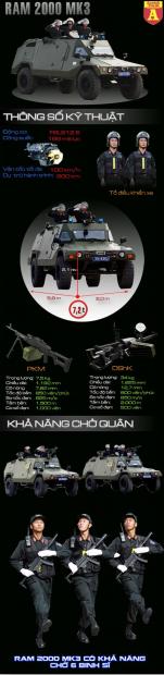 An ninh Thủ đô từng giới thiệu Vũ khí, trang bị rất hiện đại của Cảnh sát cơ động Việt Nam, infographic này riêng về xe thiết giáp chở quân hạng nhẹ RAM 2000 MK3