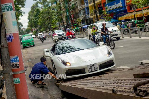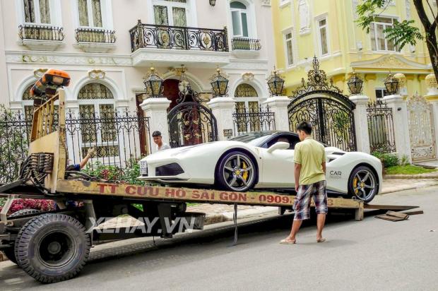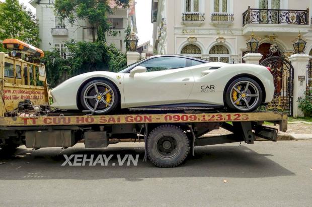 Siêu xe Ferrari 488 GTB màu trắng, cũng là chiếc siêu xe Cường Đô La cầm lái ở chuyến đi vừa qua, được vận chuyển lên xe chuyên dụng để chở về Quận 5.