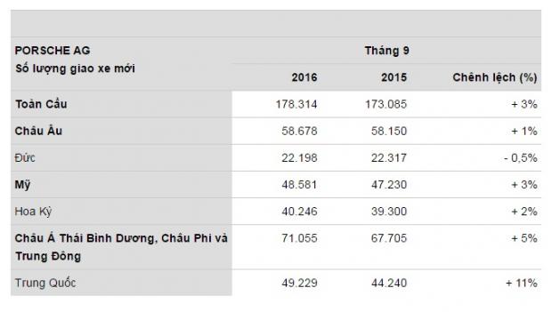 So sánh với cùng kỳ năm trước, doanh số của dòng xe thể thao cổ điển 911 cũng đạt 25.993 xe (tăng 5%), và số lượng xe được giao của dòng xe Cayman là 8.471 xe (tăng 4%). Doanh số của Panamera đã giảm nhẹ so với con số thực tế ở năm trước.