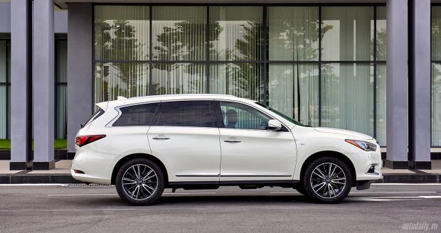 Nhìn ngang, phiên bản 2016 có độ vuốt tốt hơn, nhờ vào độ ngả của kính sau và cánh gió dài hơn. Tuy nhiên, chính cách thiết kế này tạo cảm giác hơi “nặng nề” ở phần đuôi, dù nhà sản xuất đã trang bị la-zăng kích thước 20 inch ở bản Deluxe mà chúng tôi trải nghiệm. Infiniti QX60 2016 có hệ số cản gió không đổi, vẫn là 0,34 Cd. Để đảm bảo độ bám đường và ổn định khi chạy tốc độ cao, các kỹ sự trang bị thêm cho chiếc xe hướng gió ở cản trước, cánh gió sau và đặc biệt là phần hướng gió trước lốp xe (cả 4 bánh), tránh đẩy gió vào bánh xe làm nhiễu loạn không khí ở vị trí này.