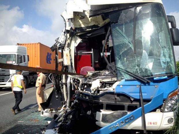 Cú tông mạnh khiến ô tô khách móp méo phần đầu, kính chắn gió bể nát, rơi vãi khắp mặt đường. Vụ việc khiến phụ xe trên ô tô khách tử vong tại chỗ và nhiều người khác bị thương nặng, được chuyển vào bệnh viện cấp cứu.