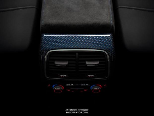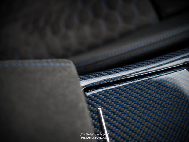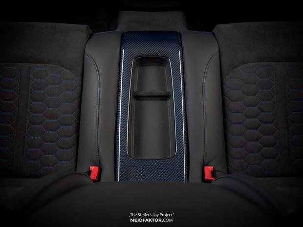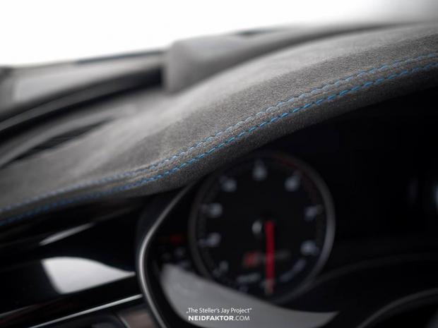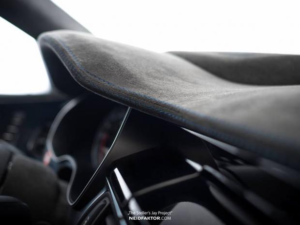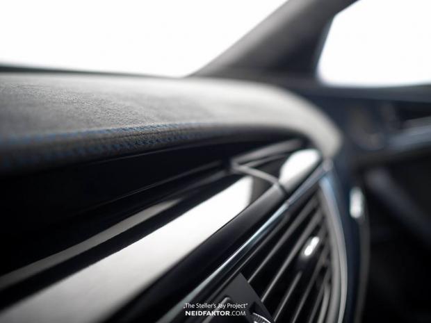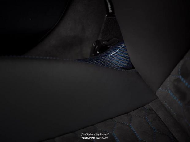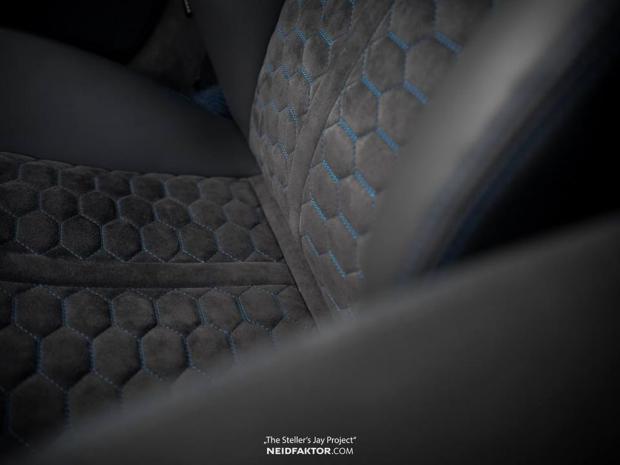 Như thể thế vẫn còn chưa đủ, bọc nội thất alcantara trang trí hết tất cả bốn ghế ngồi và hoàn hiện với đường khâu tương phản màu xanh sáng, các tấm cửa cũng rất bắt mắt, chạc chọn hộp số và vô lăng.