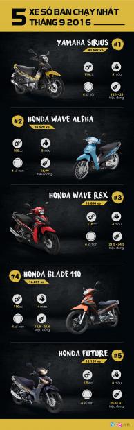 Trong 5 mẫu xe máy bán chạy nhất nửa đầu 2016 có đến 4 model của Honda nhưng Yamaha Sirius là dòng xe ăn khách nhất với doanh số hơn 210.000 xe bán ra.