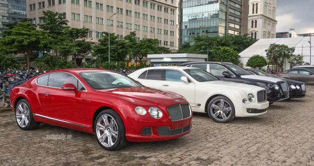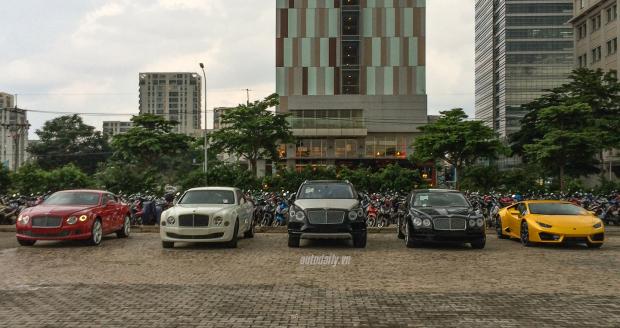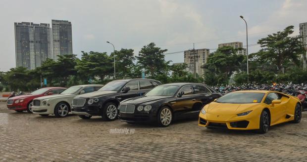 Tính từ trái qua là Bentley Continental GT W12, Bentley Mulsanne Speed, Bentley Bentayga, Bentley Flying Spur W12 và Lamborghini Huracan LP580-2. Đây là những siêu xe và xe sang sẽ góp mặt trong Triển lãm Ô tô Quốc tế Việt Nam 2016 sắp diễn ra.
