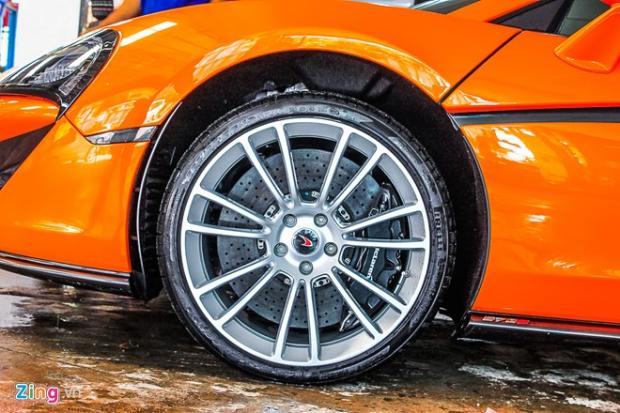 Khác với chiếc đầu tiên, McLaren 570S màu cam được trang bị mâm hợp kim đa chấu thể thao.
