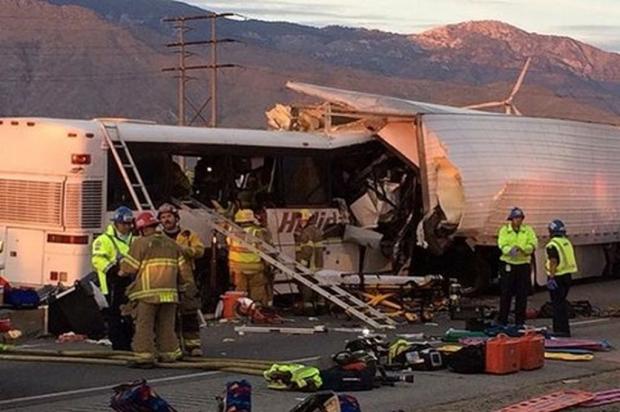 Nhà chức trách địa phương cho hay, xe buýt đã đâm vào xe tải gần Palm Springs, cách thành phố Los Angeles khoảng 100 dặm về phía đông. Hình ảnh từ hiện trường cho thấy phần đầu của xe buýt đã bị phá hủy.