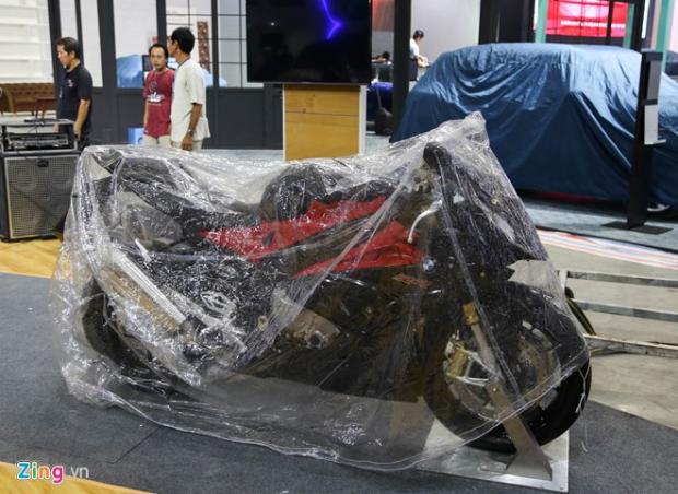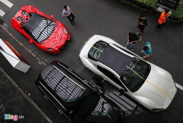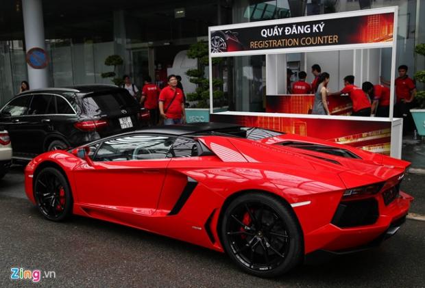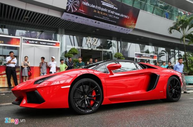 Một số nhãn hàng phụ kiện đem siêu xe tới triển lãm năm nay để thu hút sự chú ý. Chiếc Lamborghini Aventador Roadster được chuyển từ Hà Nội vào để phục vụ triển lãm.