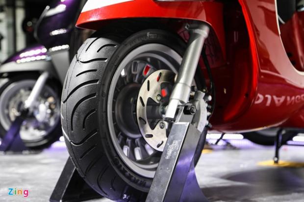 Bánh xe đường kính 12 inch cả trước và sau, sử dụng chung lốp kích thước 120/70-12.