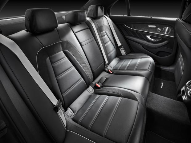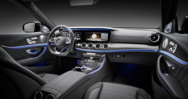 Tiến vào bên trong, ghế ngồi của xe mang logo AMG bọc da Nappa màu đen, chất liệu Carbon siêu nhẹ xuất hiện khá nhiều tại khoang cabin. Hai màn hình kích thước lớn có độ phân giải cao được đặt chính giữa bảng điều khiển và phía sau vô-lăng 3 chấu. Sự tinh tế trên E63 W213 còn được thể hiện ở những đường viền ánh sáng màu tùy chọn chạy xung quanh khoang cabin của xe. Hàng ghế phía sau có không gian rộng rãi thoải mái cho 3 người cùng ngồi.