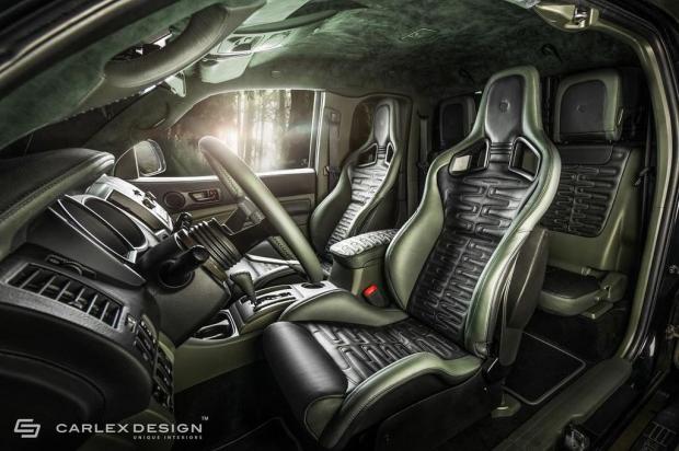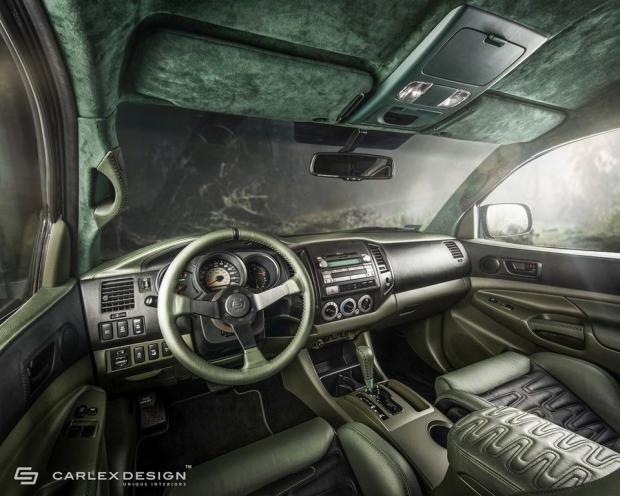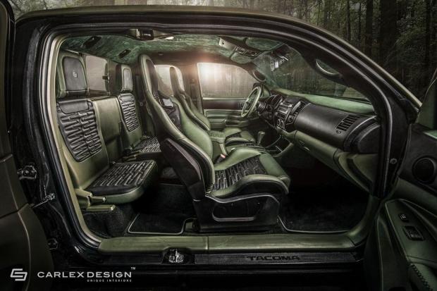 Như vậy, thay vì những vật liệu bền bỉ nguyên bản thì Carlex chọn cho nội thất của Tacoma một lớp bọc da Alcantara mịn. Những chiếc ghế thể thao mới được thêm vào cùng những đường chỉ khâu nổi bật.