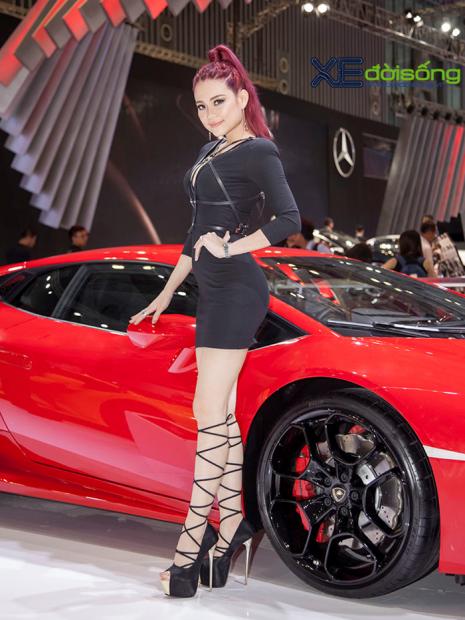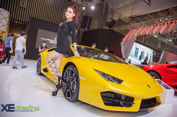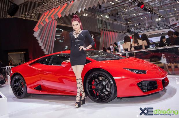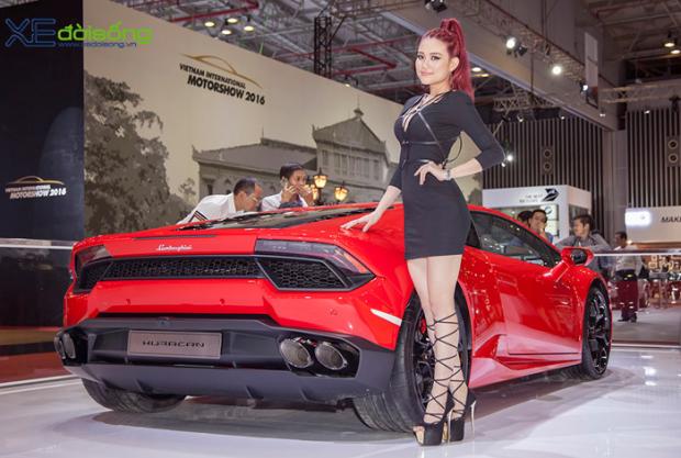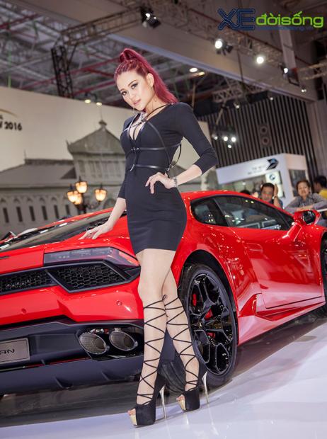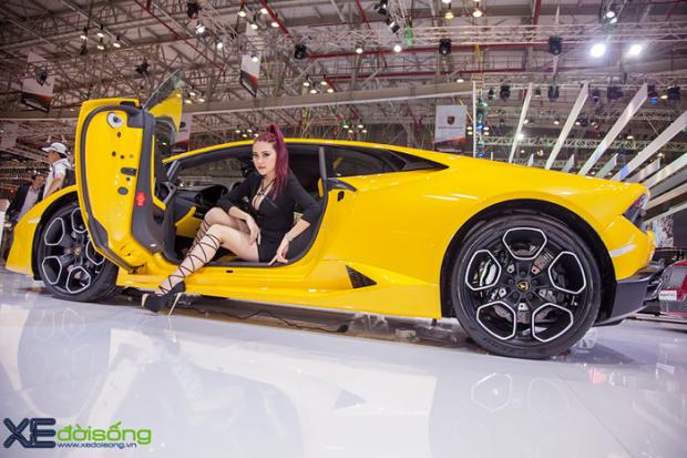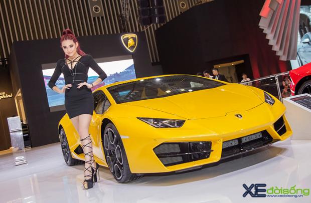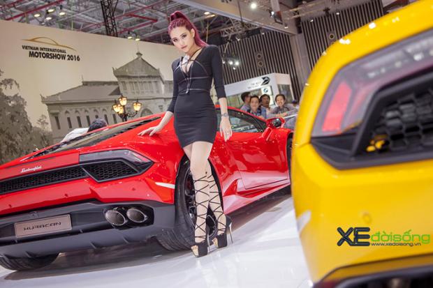 Người mẫu 'ruột' của Lamborghini Việt Nam thể hiện vẻ cuốn hút, sexy với cặp Huracan LP580-2 vàng và đỏ tại VIMS 2016.