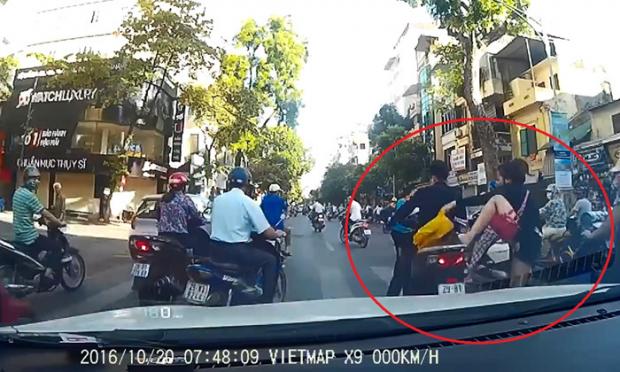 Hình ảnh cô gái ngã ra phía sau do bạn trai thốc ga. Ảnh chụp từ clip Mới đây, trên mạng xã hội xuất hiện một clip do camera hành trình trên ôtô ghi lại va chạm trên phố khiến nhiều người chia sẻ. Thời điểm của vụ va chạm là gần 8h sáng ngày 20/10/2016 tại ngã ba Đoàn Trần Nghiệp – Phố Huế, Hai Bà Trưng, Hà Nội. Theo đó, chiếc ôtô gắn camera đang di chuyển đúng làn, đúng tốc độ thì bất ngờ bị một thanh niên điều khiển xe SH không đội mũ bảo hiểm chở bạn gái tạt đầu dẫn đến va chạm.