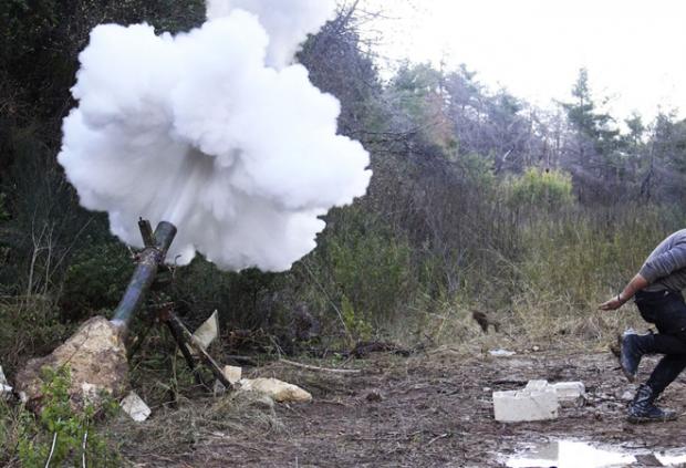 Chiến binh Quân đội Syria Tự do tìm chỗ núp sau khi phóng một quả đạn pháo về phía quân đội của Tổng thống Bashar al Assad ở Jabal al Akrad vào ngày 25-2-2014 (Ảnh: Reuters)